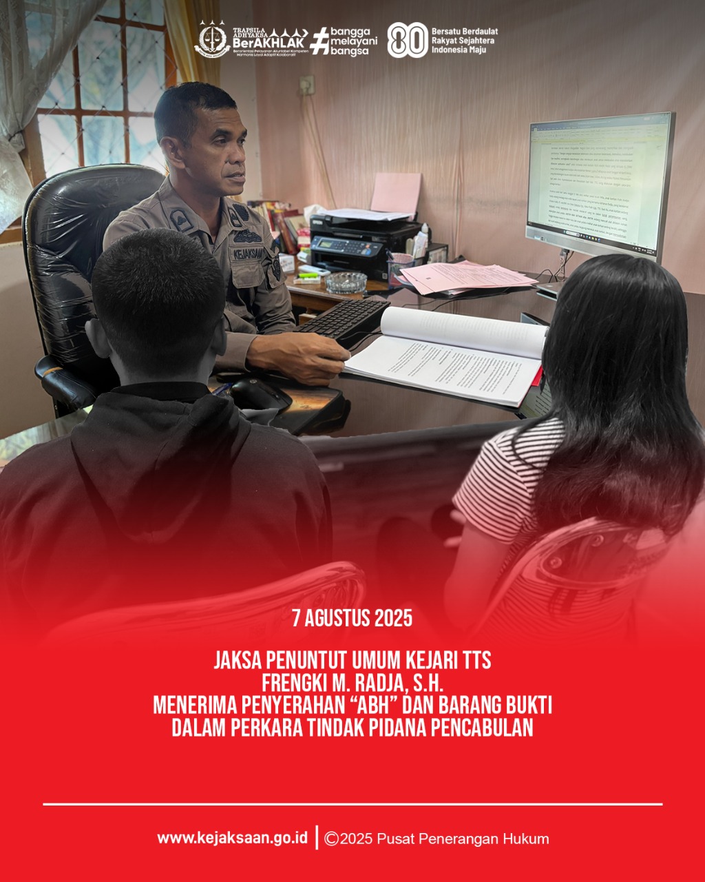 KEJARI TTS, SOE - Jaksa Penuntut Umum (JPU), Frengki M. Radja, S.H. Kejaksaan Negeri Timor Melaksanakan Tahap II Penyerahan Anak Berhadapan dengan Hukun (ABH) Dan Barang Bukti Dari Polres TTS Ke Kejari TTS Dengan ABH a.n. “J.N.D” Dalam Perkara Tindak Pidana Pencabulan di Ruang Kerja Kasi Pidum, Kamis, (07/08/2025).